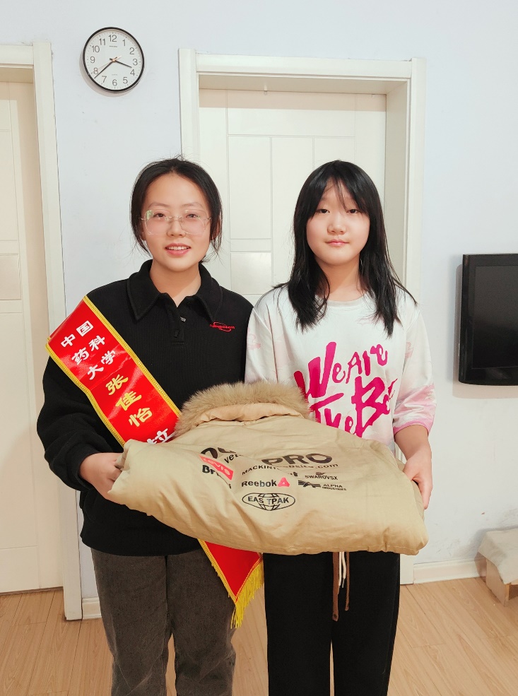 (图为中国药科大学张佳怡同学用个人奖学金为留守儿童设立助学鼓励金,图为张佳怡同学与留守儿童的合影右一是张佳怡同学,左一是留守儿童)