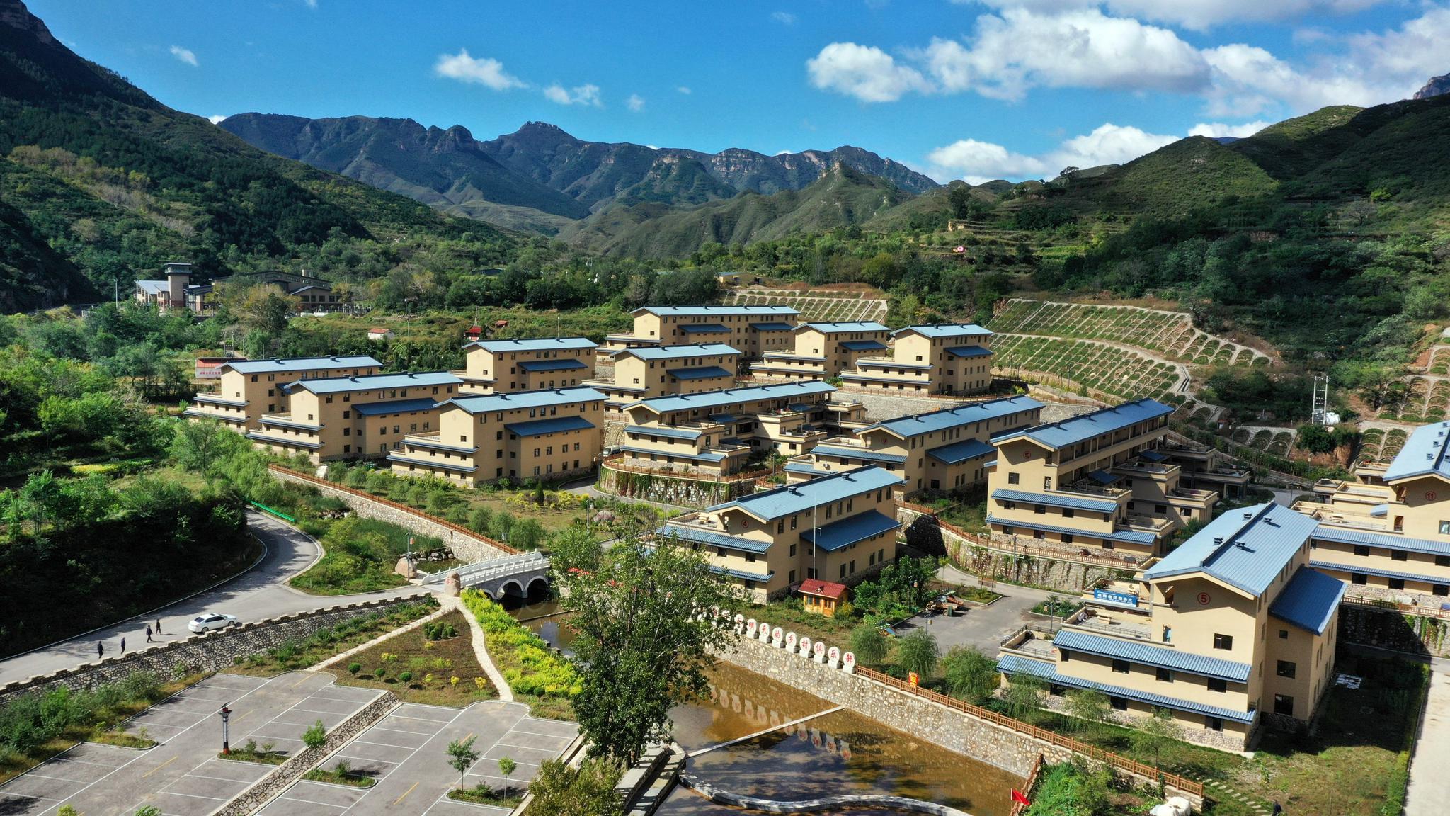 灵丘县龙渠沟有机社区的楼房掩映在青山绿树间(9月23日摄,无人机照片)。新华社记者 柴婷 摄