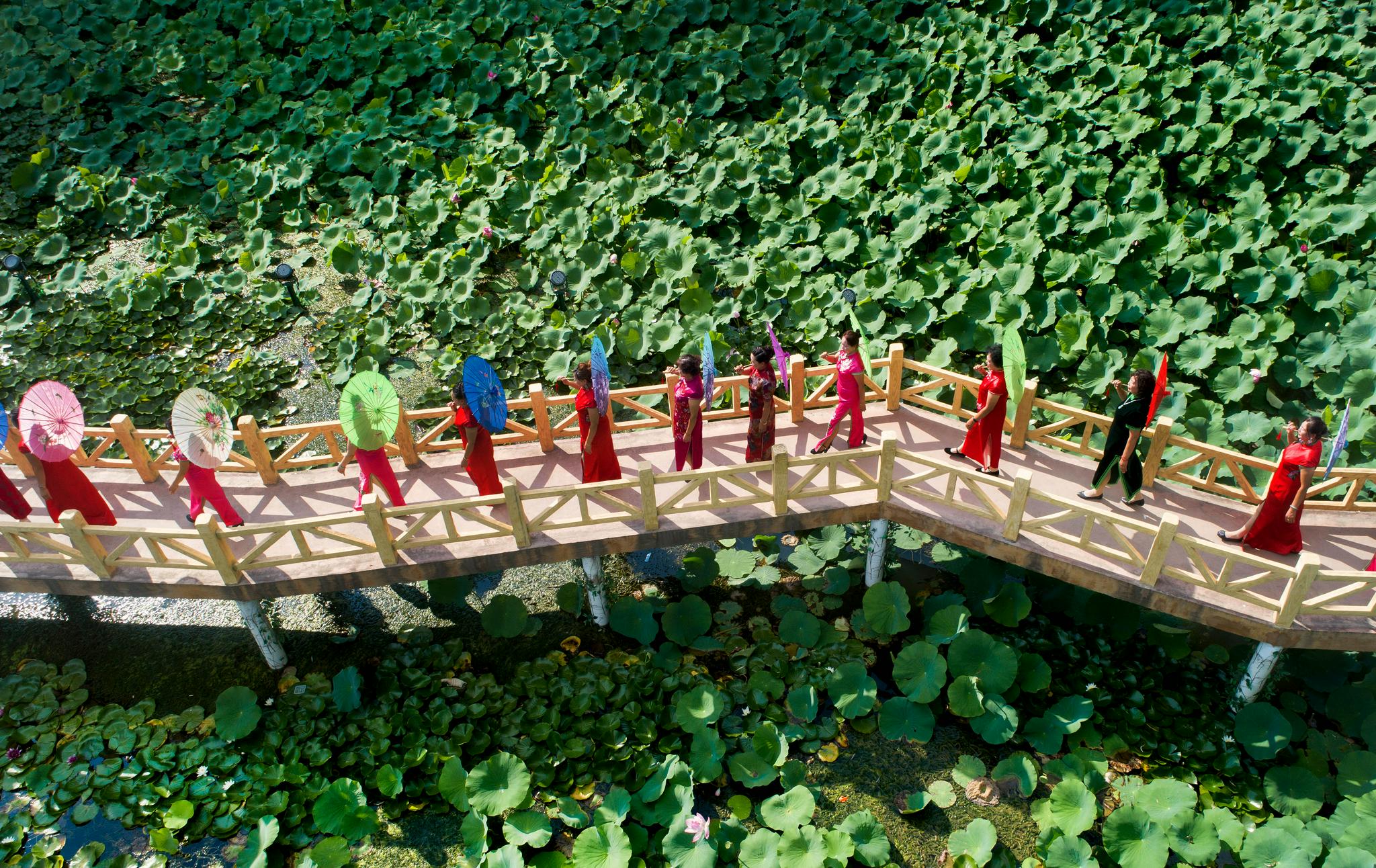红石塄乡北泉村村民在荷花节上为游客表演旗袍秀(8月26日摄)。新华社发(李涛摄)