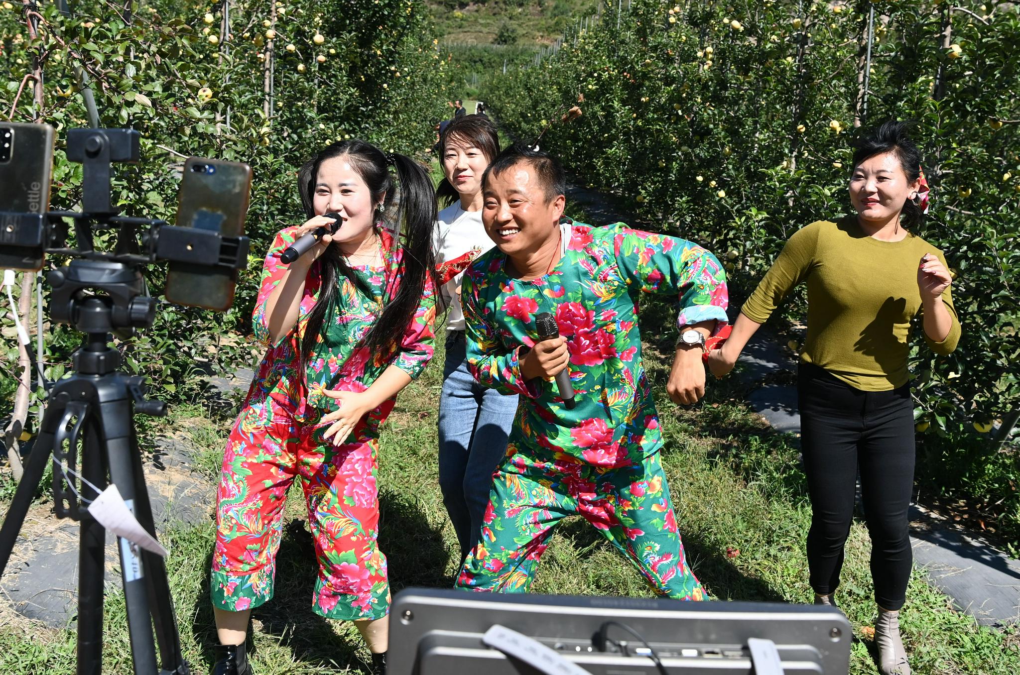 当地小有名气的“小四子”直播团队在红石塄乡红石塄村月亮湾万亩苹果园直播带货(9月23日摄)。新华社发(李涛摄)