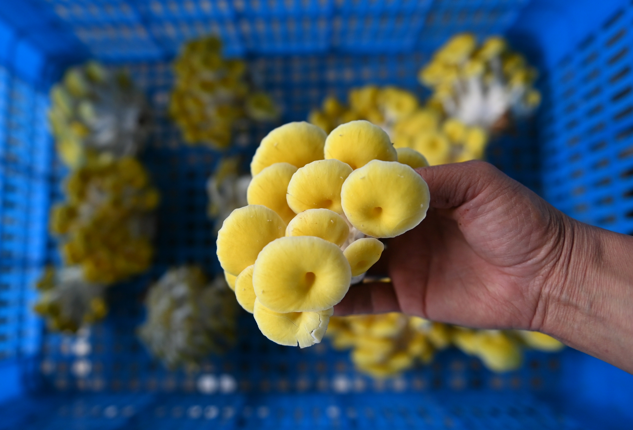 灵丘县下沿河村的村民马德在大棚采摘成熟的愉黄菇(9月24日摄)。 新华社记者 柴婷 摄