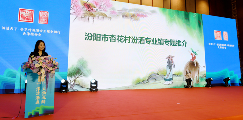 在推介会上,李蕊霞借助图文并茂的PPT,多维度多角度向与会人员重点推介了汾阳悠久的酿酒历史、众多酒类品牌、完善的基础设施以及优越的营商环境,将汾阳清香白酒的崛起和专业镇建设的势头,全方位呈现在与会人员面前。