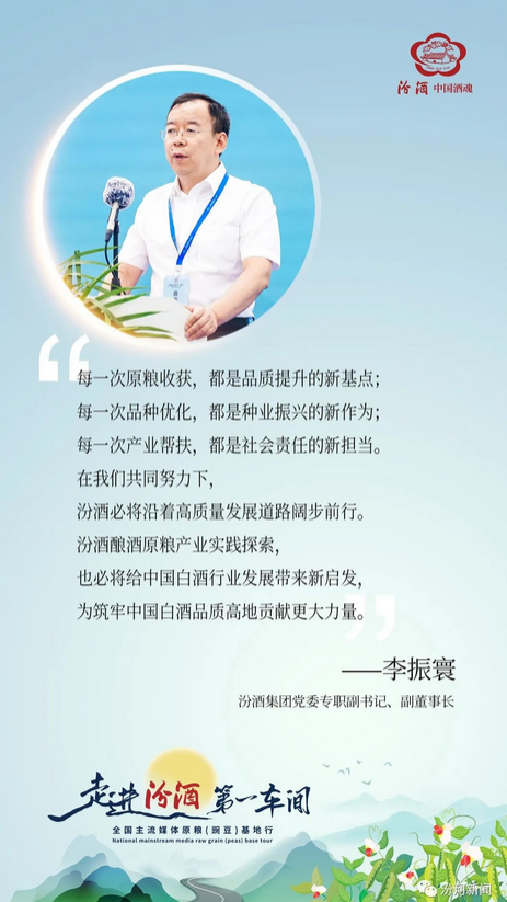 2023年,汾酒再次携手全国主流媒体共同走进“汾酒第一车间”,将汾酒的“匠心”完整地传递给消费者,进一步为汾酒高质量发展赋能助力。就如何走好汾酒原粮基地高质量发展道路,李振寰表示,汾酒坚守绿色产酿源头,每一次原粮收获,都是品质提升的新基点;汾酒为打造清香酒魂注入极致匠心,每一次品种优化,都是种业振兴的新作为;汾酒推动帮扶产业提质增效与转型升级,每一次产业帮扶,都是社会责任的新担当。