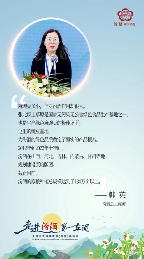 活动现场,汾酒总工程师韩英介绍,张北坝上草原是国家无污染无公害绿色食品生产基地之一,这里为汾酒的绿色品质奠定了坚实的产品根基。张北草原的种植区域是生产麻豌豆的极佳场地,也正是这种最高品质的麻豌豆,在制曲发酵的过程中融入汾酒,粱香与豆香的融合呈现出独特的气味和风骨,经历匠心酿造而清香久远。选择张北,无疑是汾酒酿造十大秘诀中,“粮必得其实”的一大体现。