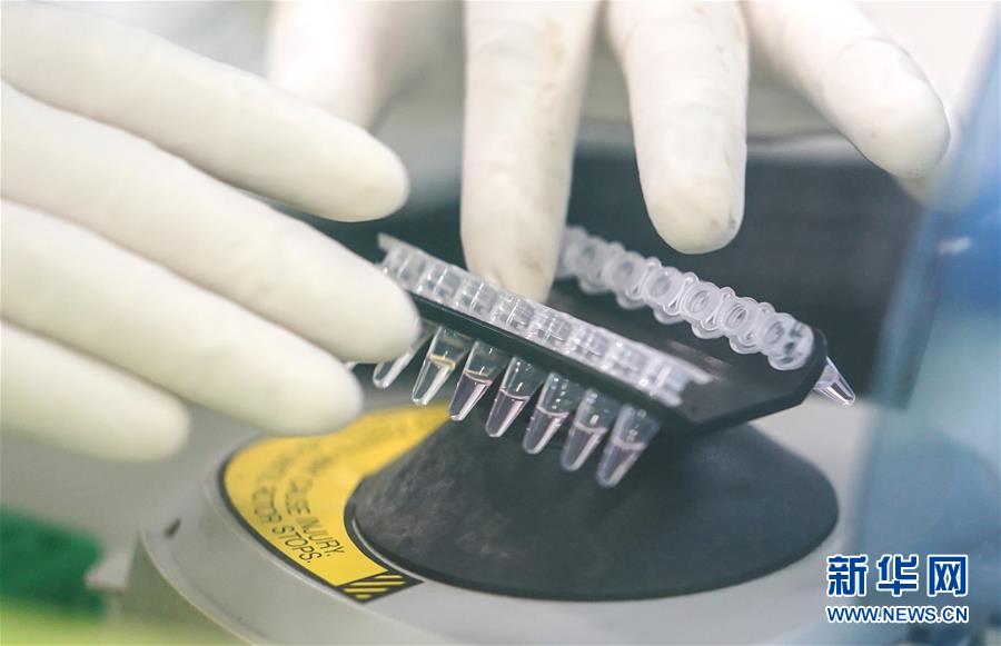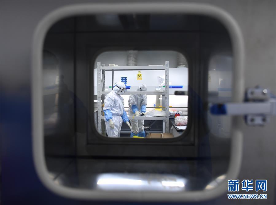 湖北省新型冠状病毒核酸检测的服务机构之一、武汉金域医学公司核酸检测实验室检测人员在处理样本(2月13日摄)。新华社记者 程敏 摄